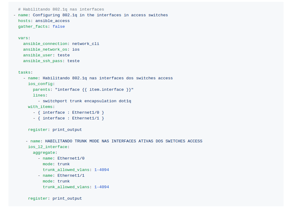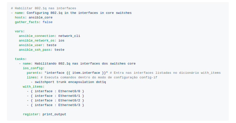 Dica: Ao declarar minhas variáveis de comunicação, utilizei o parâmetro network_cli que se refere no modo de conexão CLI sobre SSH. Vale ressaltar que não são todos os módulos de redes que suportam esse tipo de protocolo de comunicação.