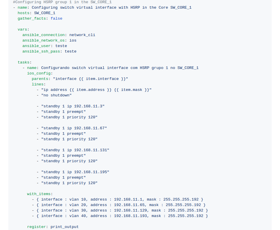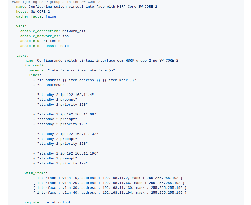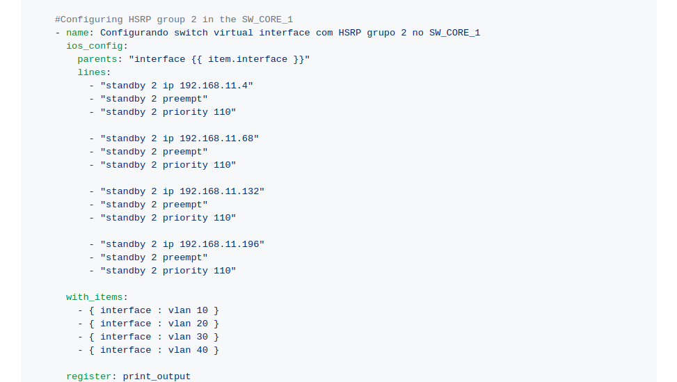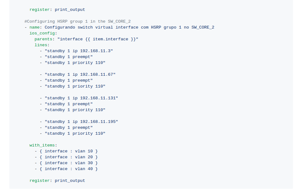 A quinta task faz junção com a sexta task. Essas duas tasks irão utilizar o módulo ios_config para criar dois grupos de HSRP seguidos de SVIs para fazer load balancing de tráfego entre as vlans.